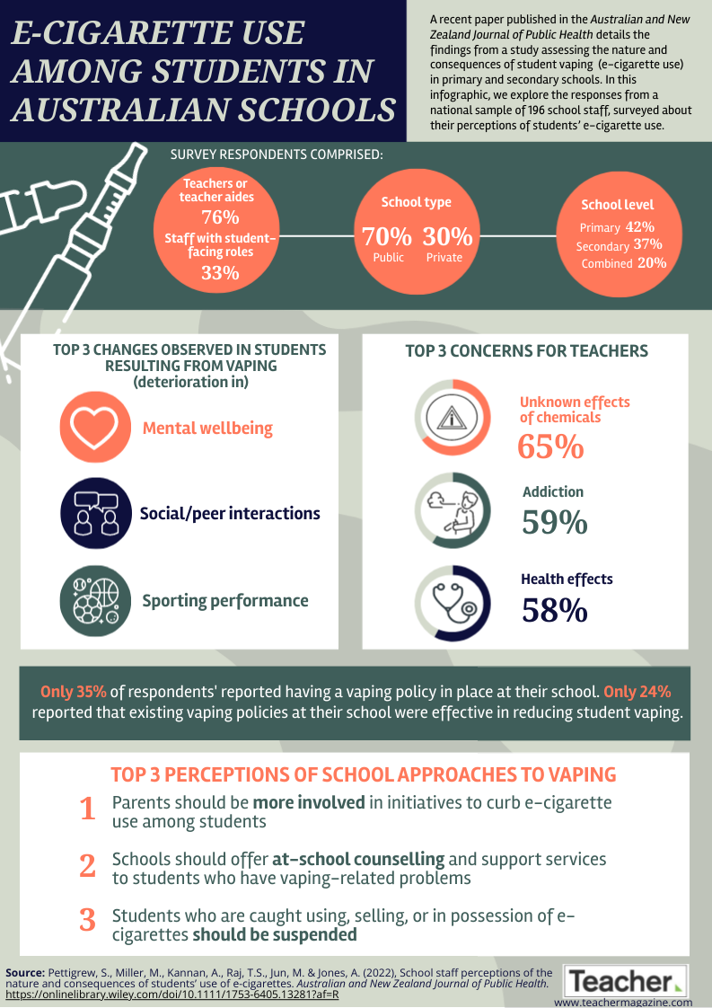 Thinking about your own school context, is e-cigarette use prevalent amongst students? If so, how does this affect your students’ wellbeing, social interactions and participation in classes? Does your school have appropriate vaping policies and programs in place to support teachers with student’s e-cigarette use?