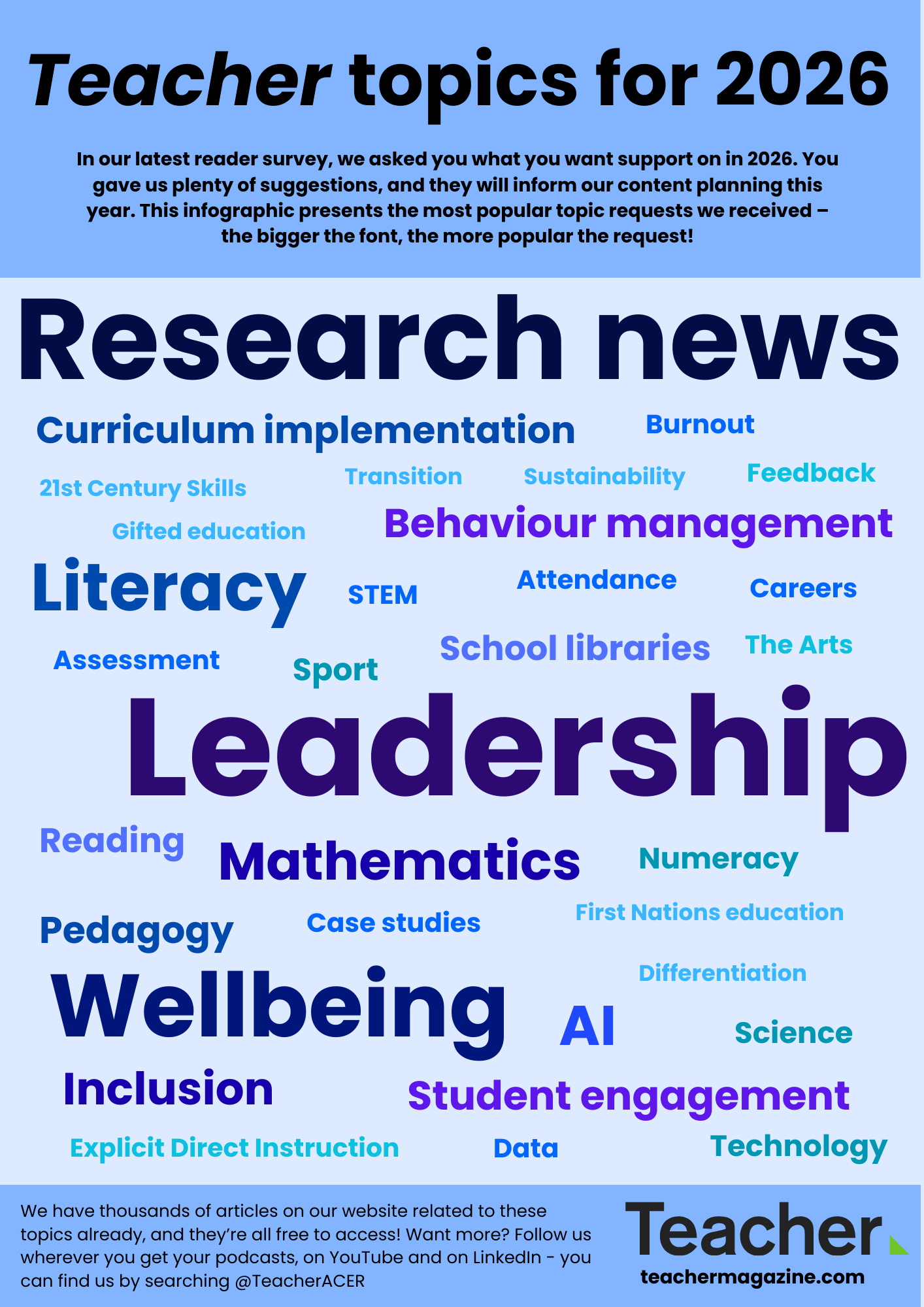 Missed out on any of our infographics? Visit the Teacher magazine infographic archive. All our infographics are also available to download as PDF versions from the ACER Repository.
