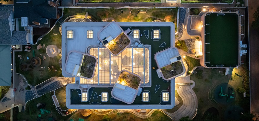 Working creatively within the limited space, architects also achieved the design of a spatial garden by connecting the basement and ground floor gardens with stairs and grass-covered slopes, ensuring that children have plenty of opportunities for physical activity.