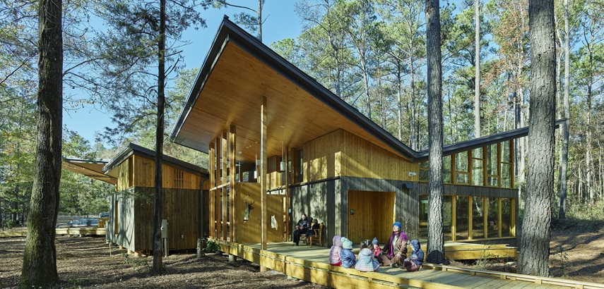 Built mostly from wood, this Environmental Education Building in the United States aims to reinforce the relationship between humans and nature and encourage children’s nature-based play.